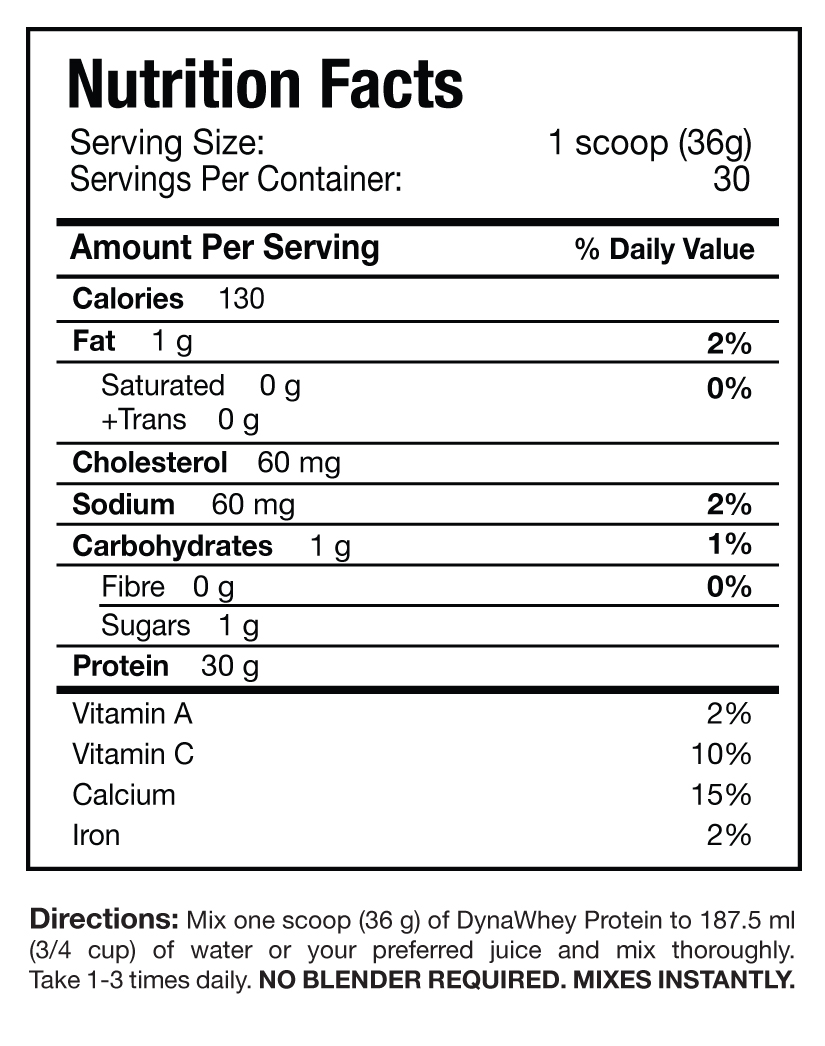 Directions: Mix one scoop (36 g) of DynaWhey Protein with 187.5 ml to 250 ml (3/4 cup